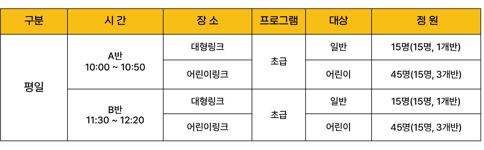 ※ 소규모 강습 접수는 개장식 (12/23, 오후 5시 30분) 이후 부터 가능합니다.